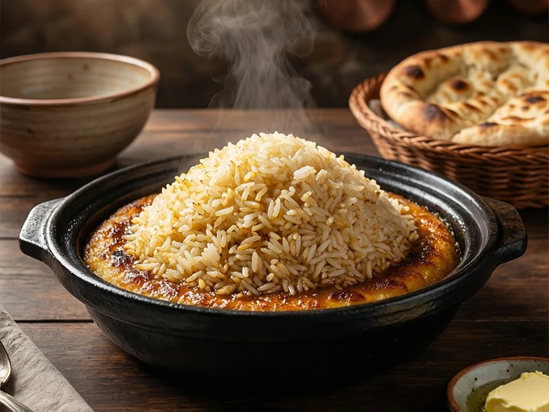 - روغن حیوانی یا کره:قبل از کشیدن برنج، مقداری روغن کرمانشاهی یا کره آب شده روی دیس بدهید تا “براق” شود.