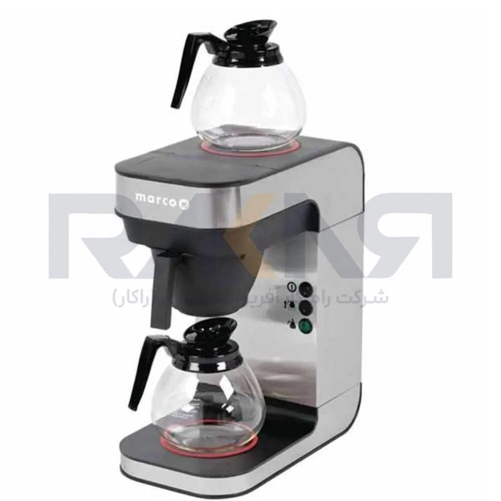 - عملکرد: این دستگاههای اتوماتیک (مانند برندهای Bunn یا Fetco که مشابه آنها در راکار موجود است)، حجم زیادی از قهوه (مثلاً ۲ تا ۵ لیتر) را با دمای دقیق و پاشش آب مهندسی شده دم میکنند و در فلاسکهای حرارتی تا ساعتها گرم و تازه نگه میدارند.