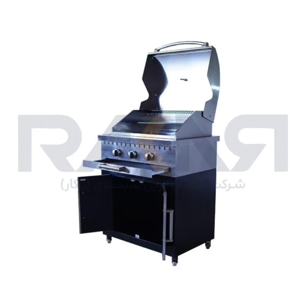 - جنس بدنه باربیکیو در قسمت بالا کامل استیل و کابینت ورق روغنی بارنگ الکترواستاتیک کوره ای است.