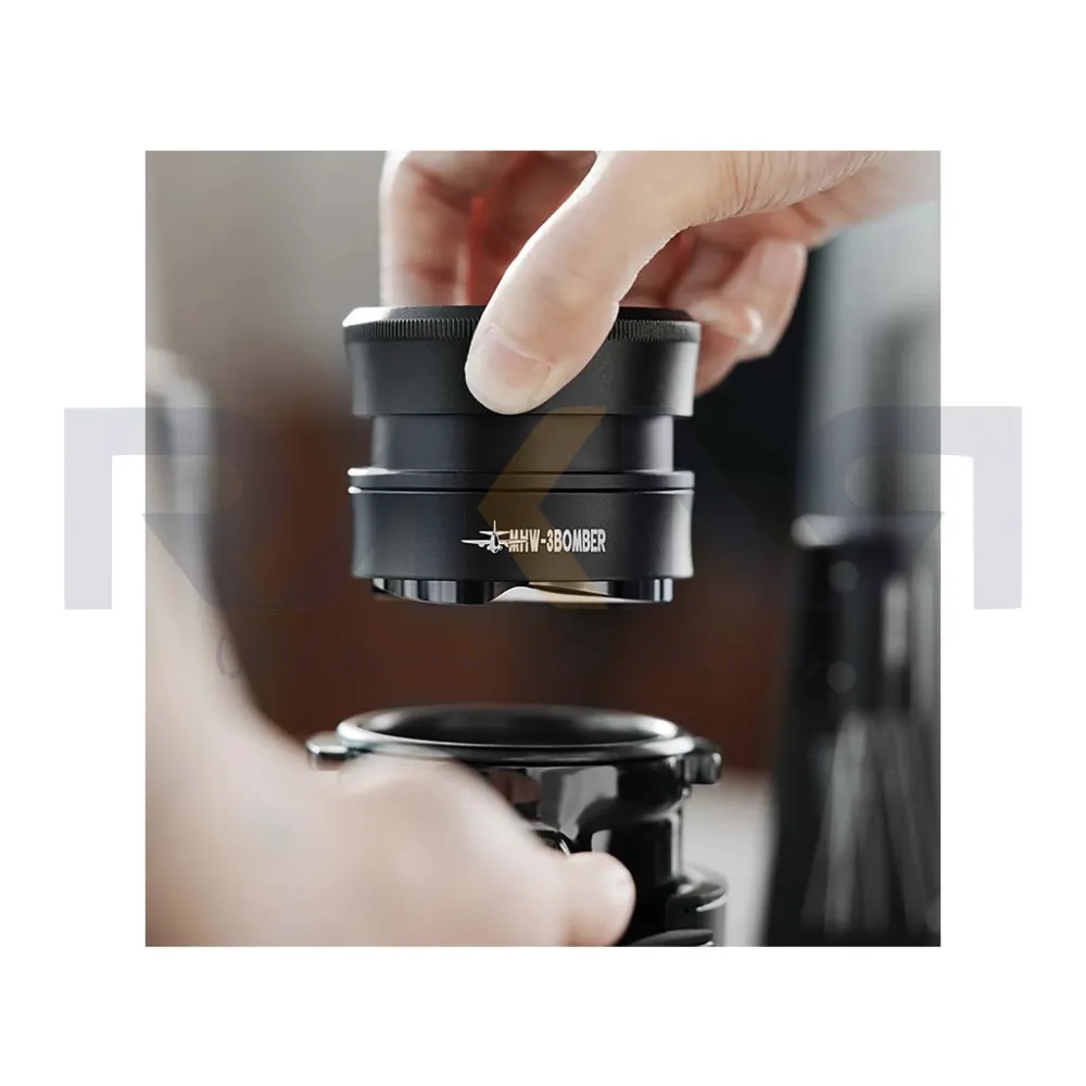 - لولر را روی پودر قهوه قرار دهید: لولر را روی سطح پودر قهوه قرار داده و با اعمال فشار ملایم، آن را به صورت دایرهای بچرخانید.