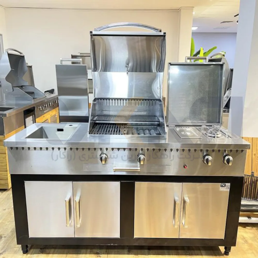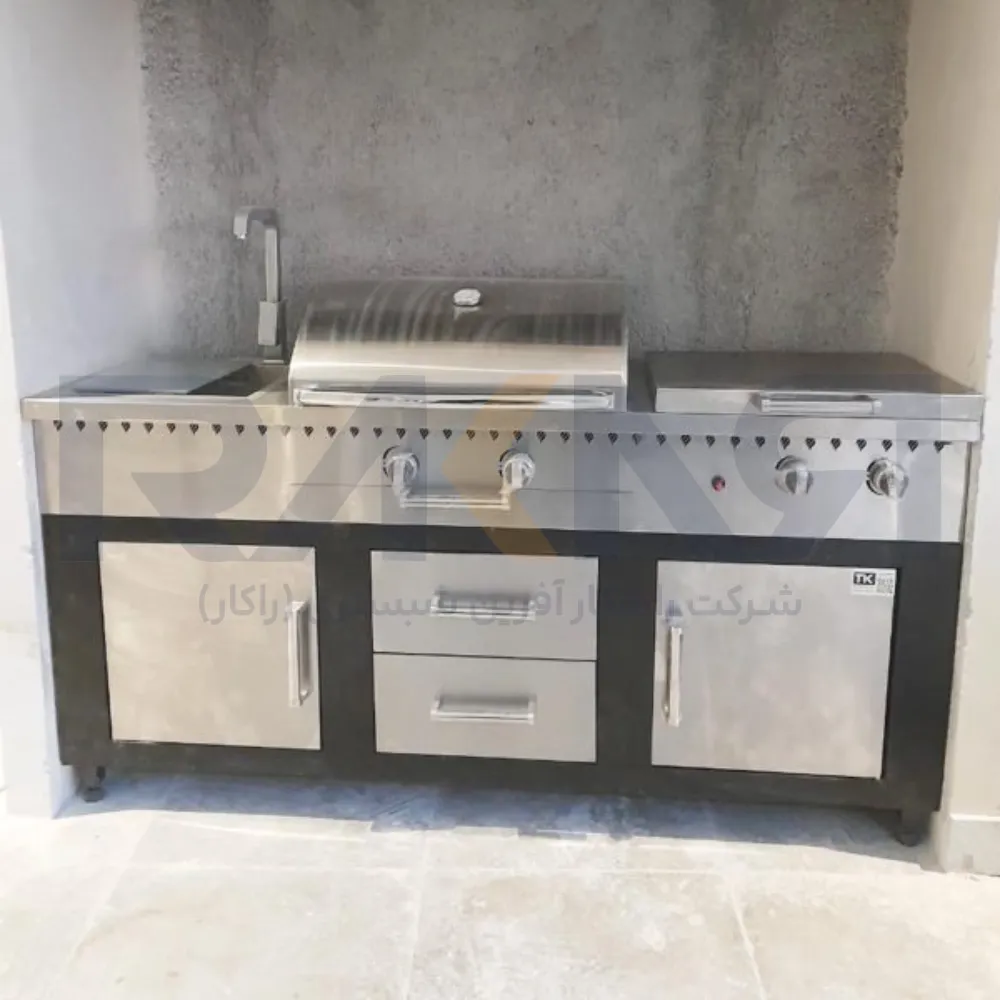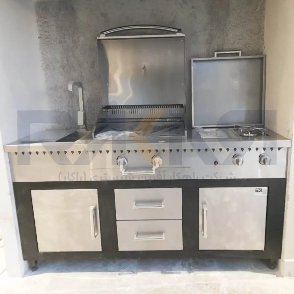 - دارای یک عدد باربیکیو گازی با درب دوجداره ترمومتر دار با عایق پتو سرامیکی و ترمومتر تمام استیل به همراه سینک و شیرآب مرغوب