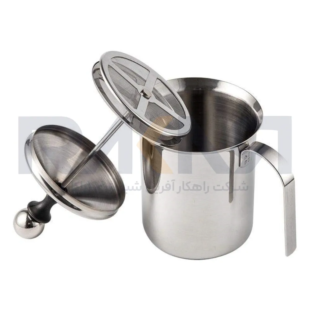 کف ساز شیر (فومر) استیل در دسته بندی کف ساز (فومر) یکی از بهترین ابزارها برای درست کردن کف شیر بصورت دستی و بدون نیاز به دستگاهی برقی می باشد. که فقط کافیست شیر را داخل آن ریخته و روی شعله اجاق گذاشته و صبر می کنیم تا گرم شود تا دمایی در حدود ۷۰ الی ۸۰ درجه (قبل از جوشیدن) برسد.سپس توری دولایه را در ظرف قرار داده و اهرم آن در حدود ۲۰ بار بالا و پایین می کنیم تا شیر کف کندو از کف آن برای کاپوچینو، موکاچینو، دالگونا و یا نوشیدنی های دیگر استفاده کنیم. این وسیله تمام استیل می باشد و شستوشوی آن کاملا آسان است. مزیت این مدل نسبت به مدل های دیگر عمر مصرف بالاتر و مقاومت در برابر ضربه، امکان قرار گیری بر روی حرارت و فیلتر دو مرحله ای است.
